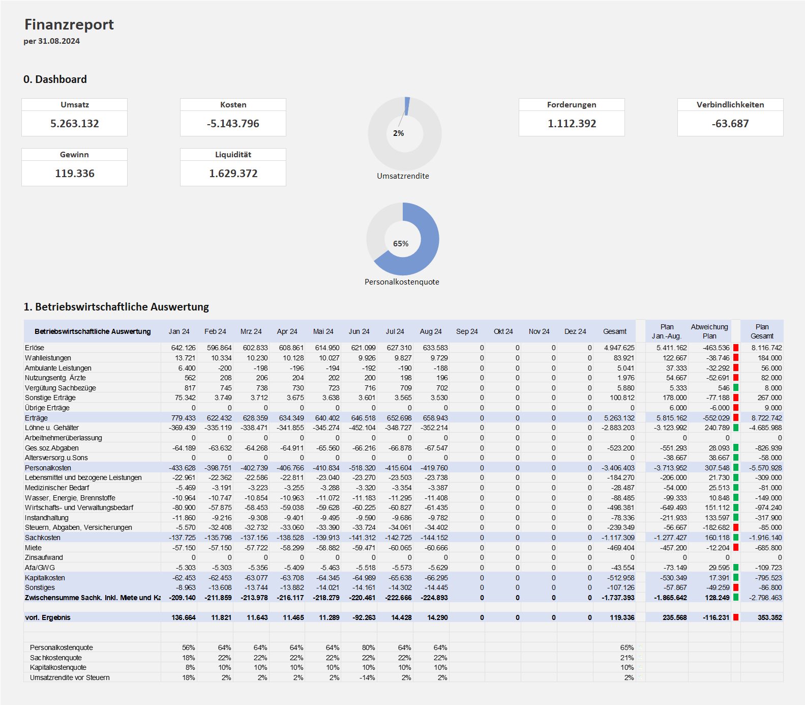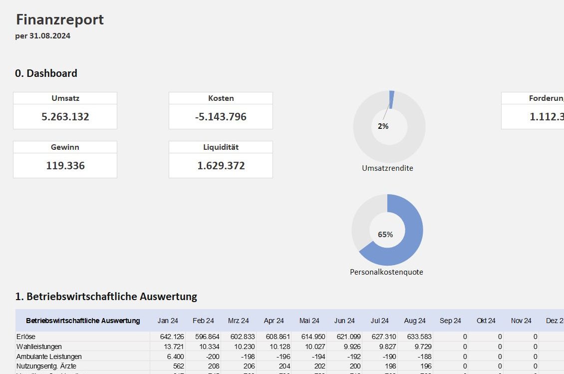 Unser Excel-basiertes Reporting wird von erfahrenen Controllern erstellt und baut direkt auf den Buchhaltungsdaten Ihres Unternehmens auf. Ihre betriebswirtschaftlichen Kennzahlen werden klar und übersichtlich dargestellt. Der entscheidende Vorteil: Es fallen für Sie keine zusätzlichen Softwarekosten an. Sie erhalten Ihre maßgeschneiderten Reports in einem erprobten Format, das transparent und leicht verständlich ist.